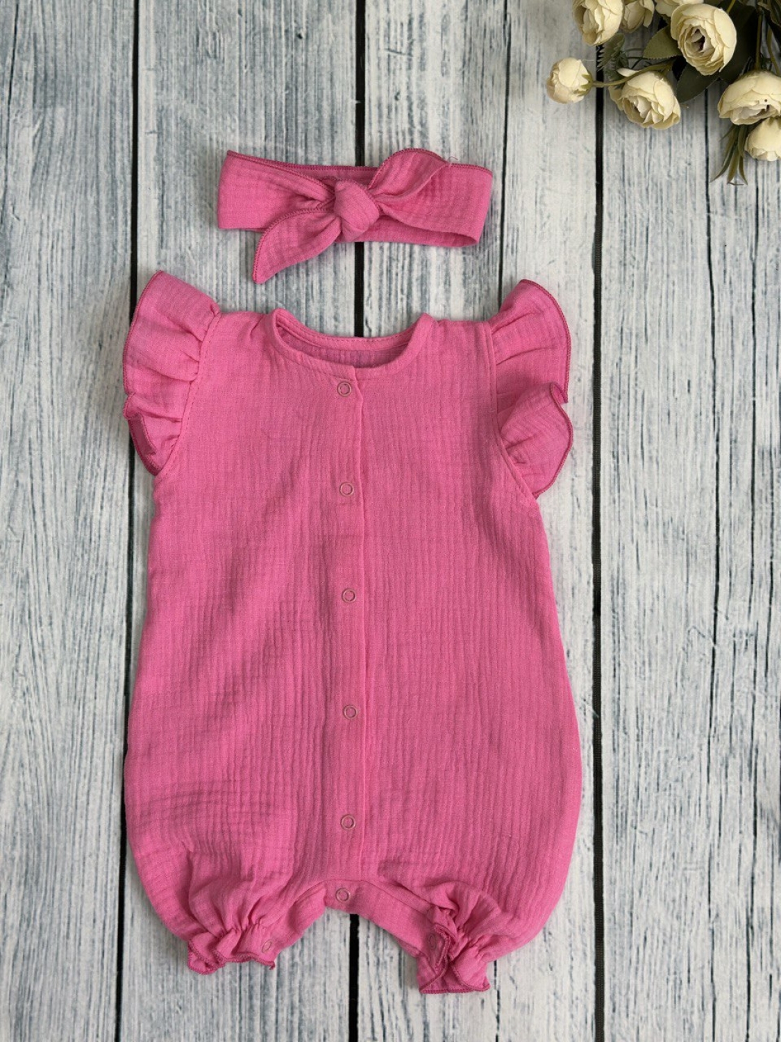 Купить оптом 341-Ф. Песочник с повязкой для девочки из муслина, хлопок 100%, р 62,68,74,80 фуксия в Норильске